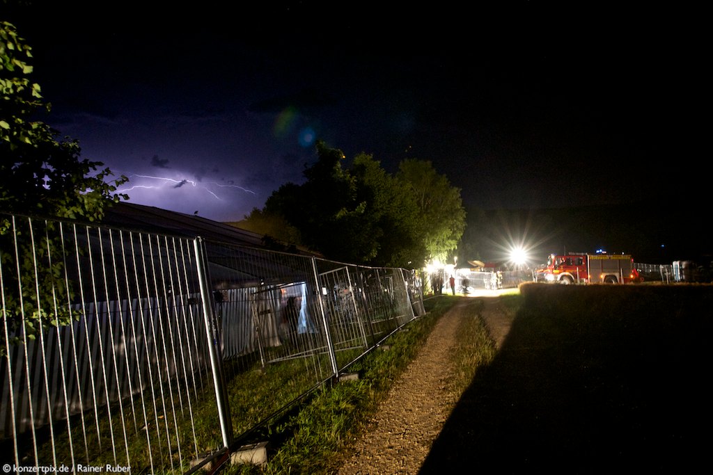 Mit dem Ende des Caliban-Gigs kam das Unwetter. Der Auftritt von Rage verzögerte sich daher um einige zehn Minuten, während derer draußen das Unwetter einigen Leuten das Zeltabbauen abgenommen hatte. Auch das Red Bull-Zelt stand danach nicht mehr… Respekt für die Verantwortlichen, die besonnen reagiert hatten, zur Ruhe aufgerufen hatten und die Besucher ins Festzelt holten, das deutlich stabiler als die ganzen anderen Zelte gebaut war.